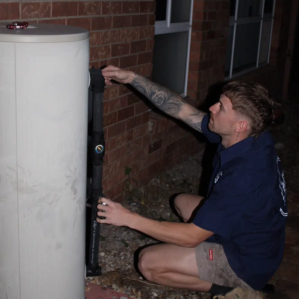 A Emergency plumber in the dark working on a Hot Water Service as part of Emergency Plumbing Services Gold Coast